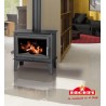 Estufa de leña de doble combustión. La decoración de las puertas genera efectos de transparencia que captan la luz.