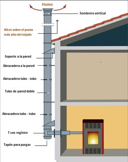 Como las estufas de pellet llevan un ventilador para expulsar los humos de la combustión (tiro forzado), a diferencia de las de leña, que funcionan a tiro normal, no haría falta un tramo en vertical, una vez atravesada la pared, sin embargo, conviene tener un tramo en vertical, para ayudar a la expulsión de gases, y sobre todo para poder colocar un registro en T con tapón, para la limpieza de los tubos y para realizar purgas, ya que es allí donde caerán las cenizas, suciedad y humedad condesada. Esta T evitará que pueda llegar a la estufa de pellet agua, suciedad o cualquier objeto extraño o bicho que se cuele por la tubería.