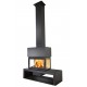 Chimenea a la derecha O la izquierda de la bancada con campana de formato contemporáneo. Con placas de vermiculita. Toma de entrada de aire exterior. Doble combustión. Fabricada en chapa de acero. Incorpora cajón de cenizas, registro primario y secundario, cristal vitrocerámico 750°C y pintura anticalórica.